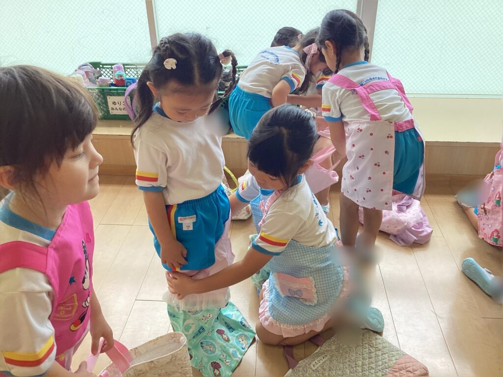 初めに年長さん年中さんのペアと一緒にエプロンを付けます。