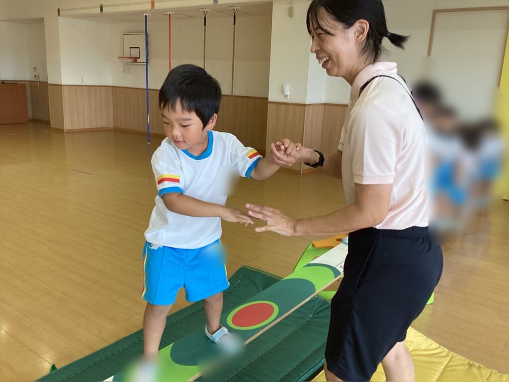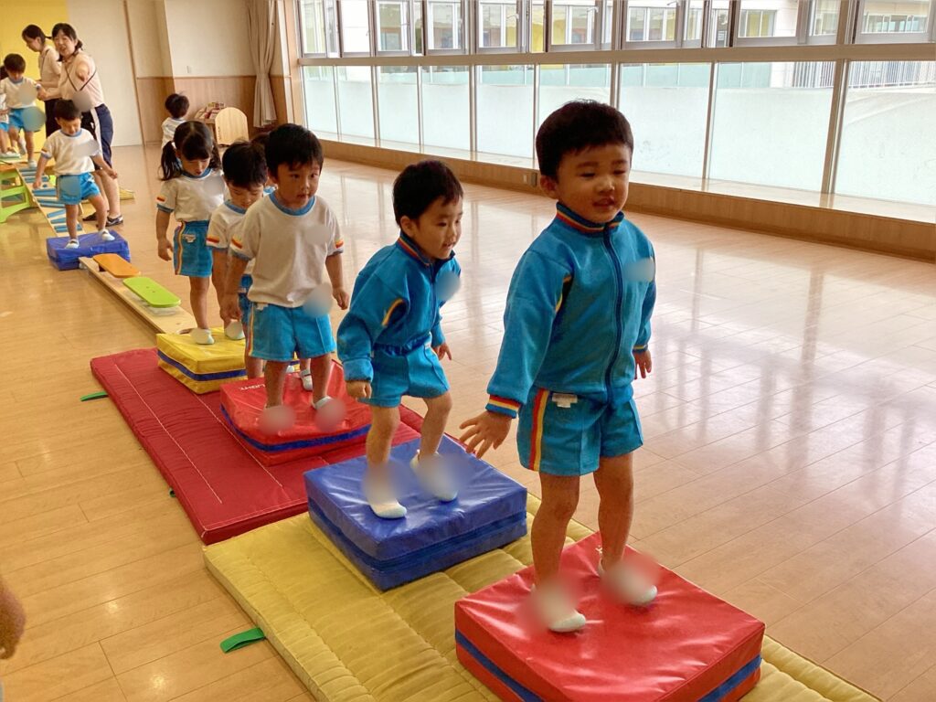 マットの島をジャンプして渡るコーナーなど、お部屋では中々出来ない遊びを楽しみました。喜んでもらえて嬉しかったです。
