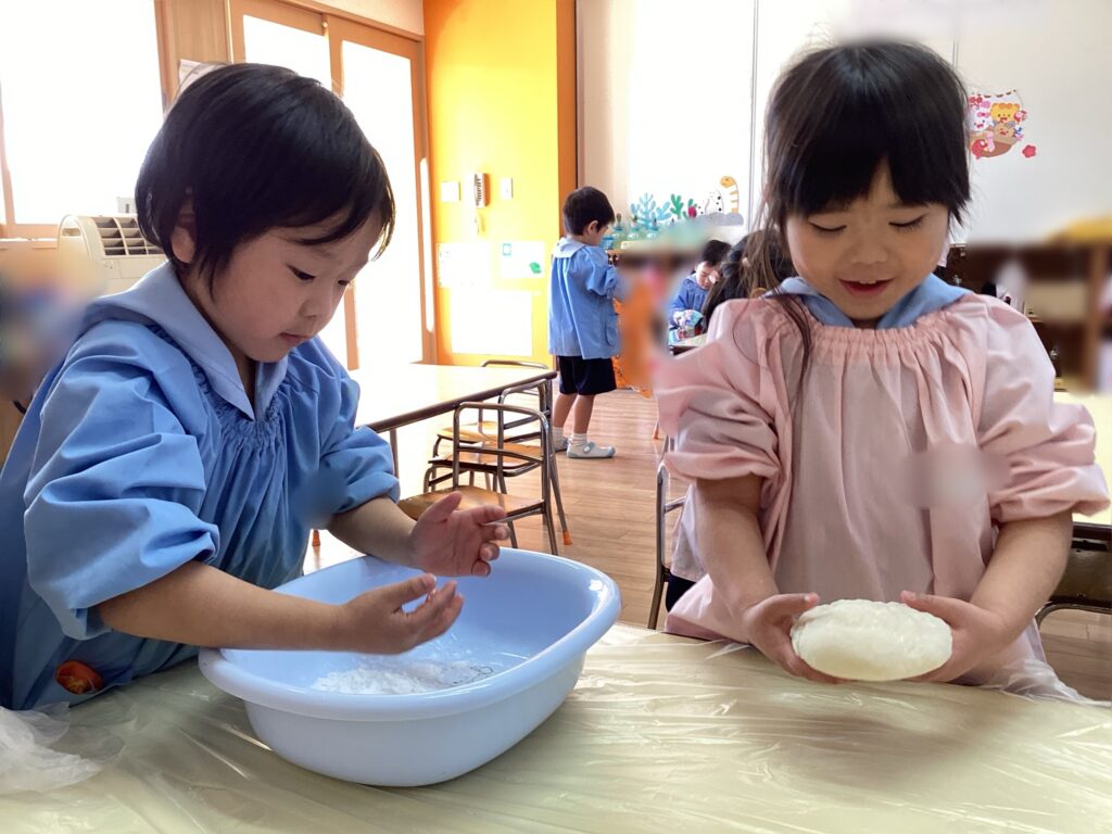 みんなの力を合わせ、びよーんと伸びるモチモチのお餅が完成しました。