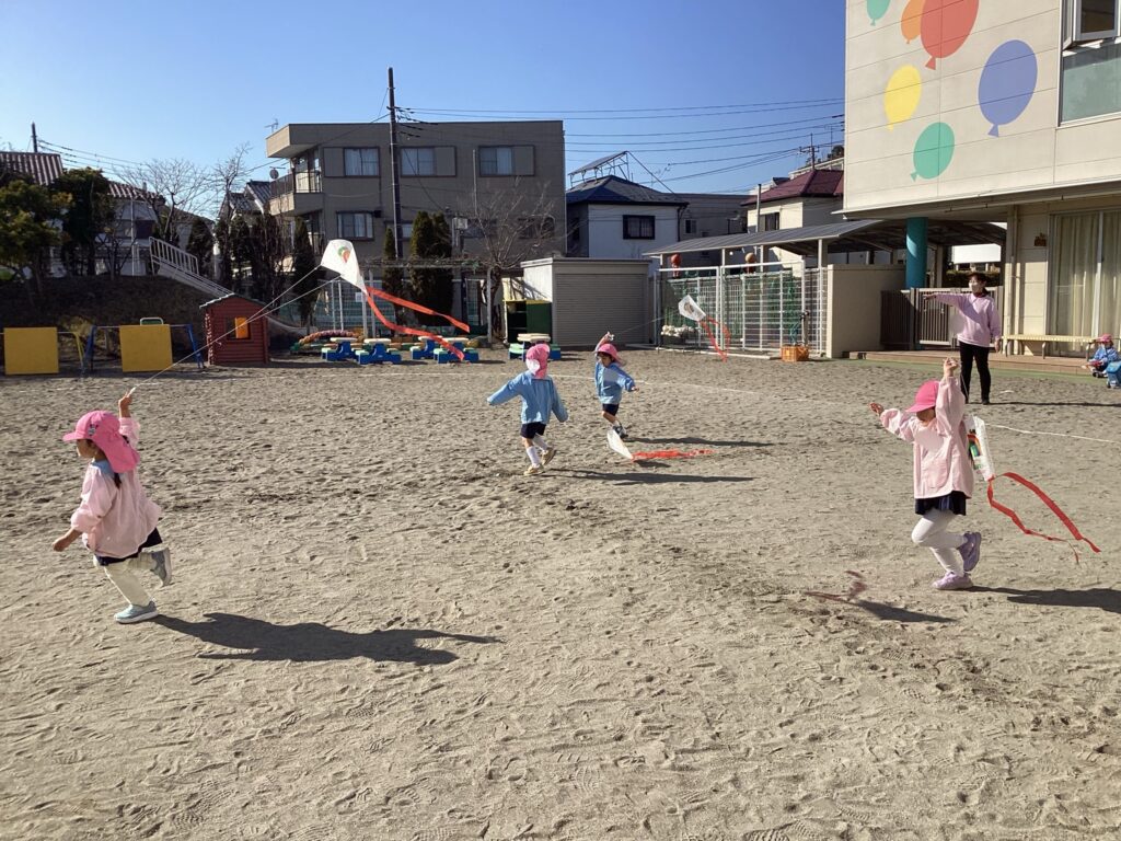 力一杯走ると、ふわっと凧が空に揚がりました。自分の凧が揚がるのを見るのは中々難しかったですが、お友達がやっているのを見て「おお〜〜」と釘付けになっていました。