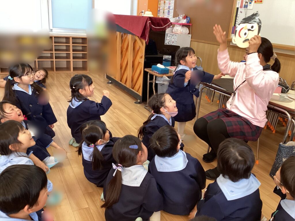 英語では福笑いをして遊びした。目隠しはせずに、1人ずつ顔のパーツを思い思いの場所に貼っていきます。