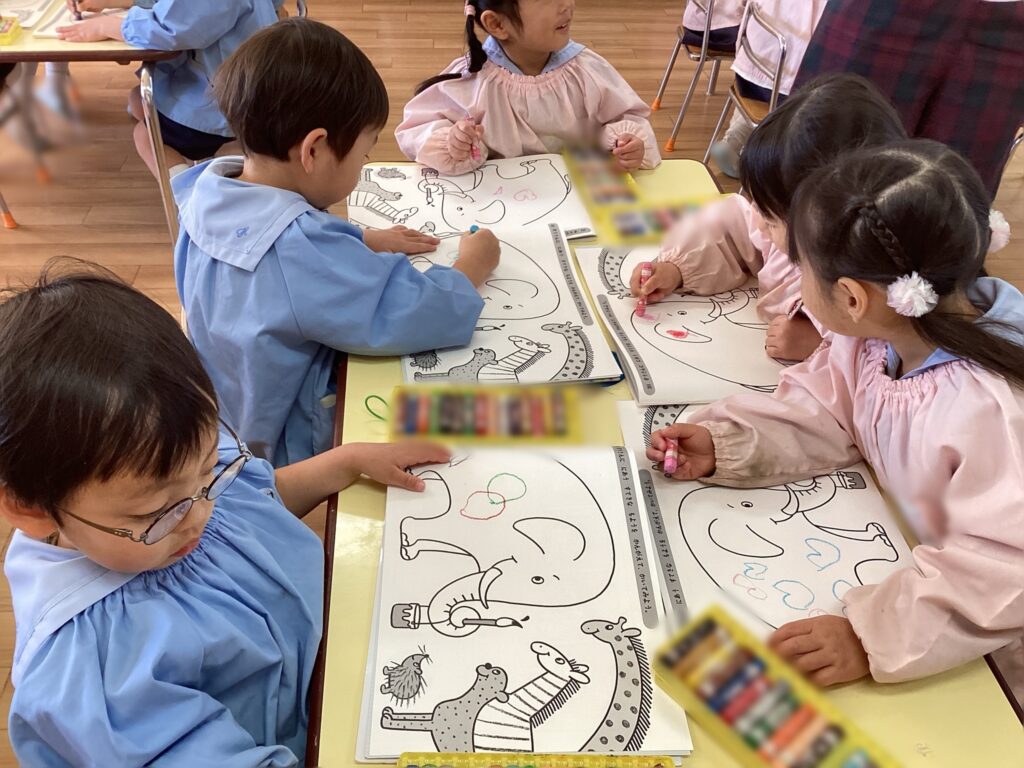 「今日は何のワーク?」と、子どもたちが大好きな線遊びもいよいよ終盤。今週は真っ白のぞうさんに好きな模様を描きました。