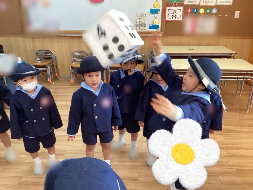 大きなサイコロを使って数遊びをしました。お友達と手を繋いで丸くなり、順番にサイコロを振ります。出た目の数だけジャンプです!