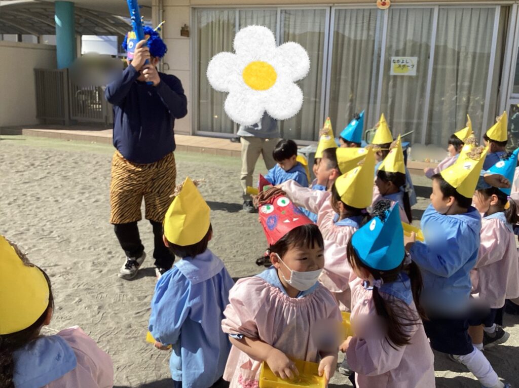朝から鬼がいつ来るのかと、そわそわしていた子どもたち。自分たちで作った帽子を被り、いざ園庭へ!