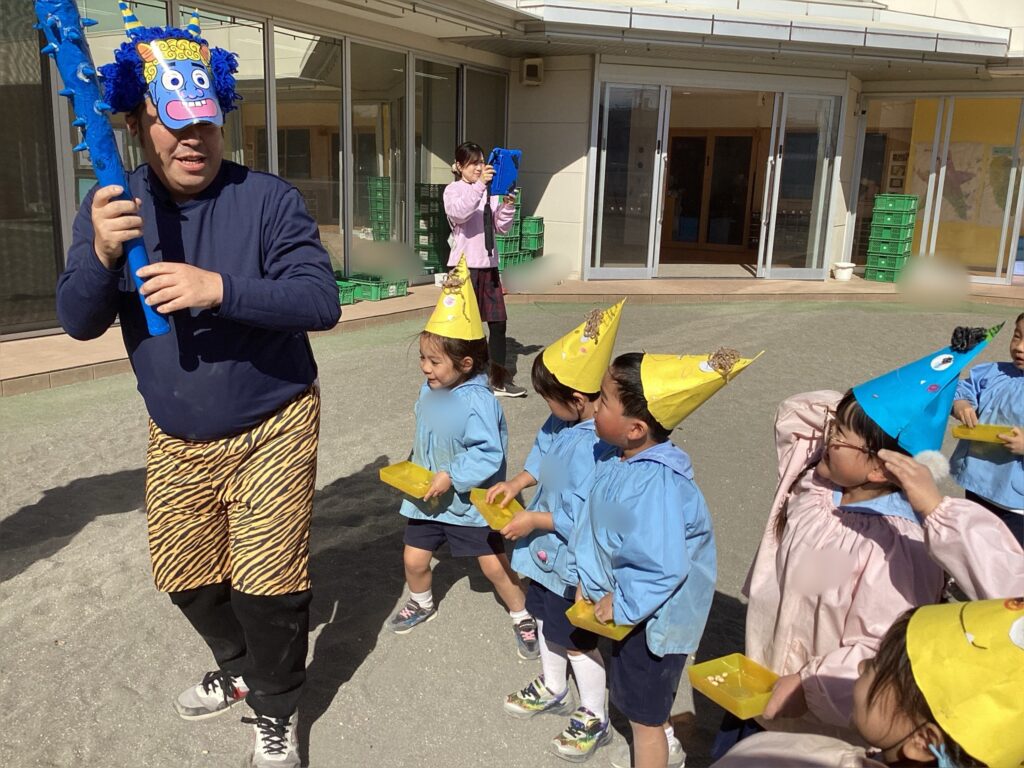 節分の由来や豆のお話を聞いていると、どこからか鬼が現れました。
