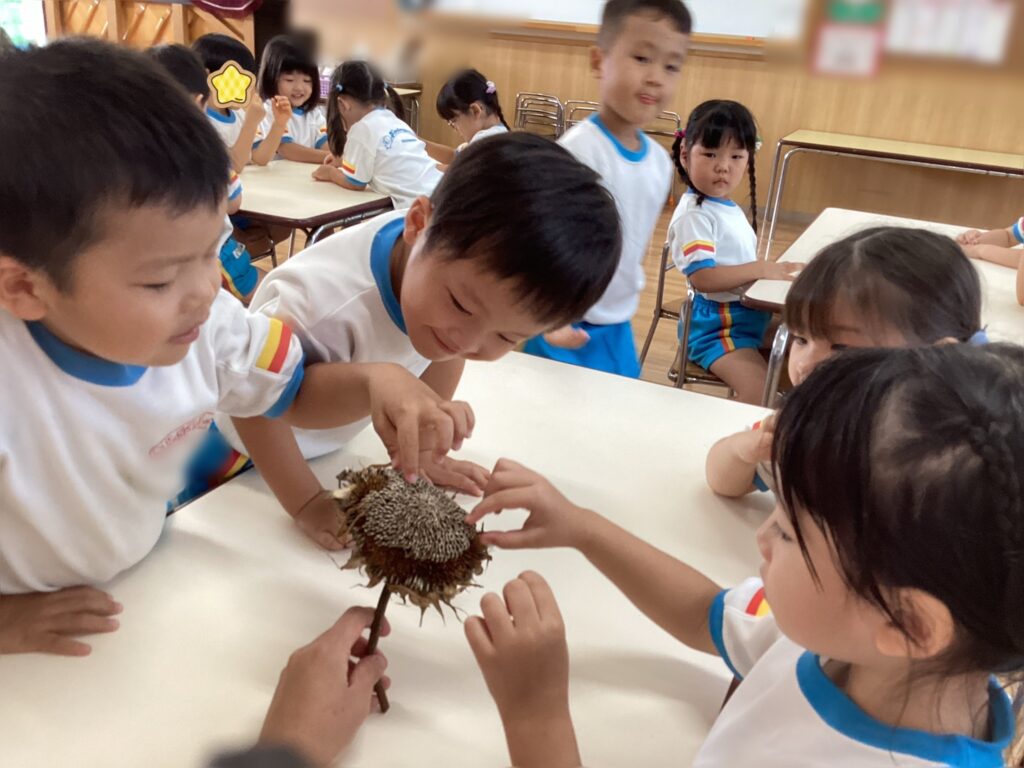 「黄色いお花だったのに茶色になったんだ!」「種が沢山あるね」など興味津々になりながら1人一つ種を取りました。