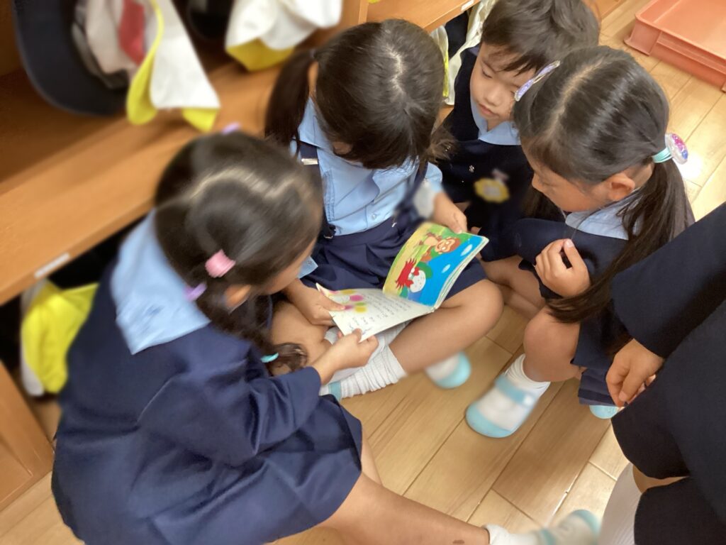 沢山のお友達と見れるよう「先生みたいに読み聞かせにしよう!」と仲良く絵本を読む姿が微笑ましかったです。
