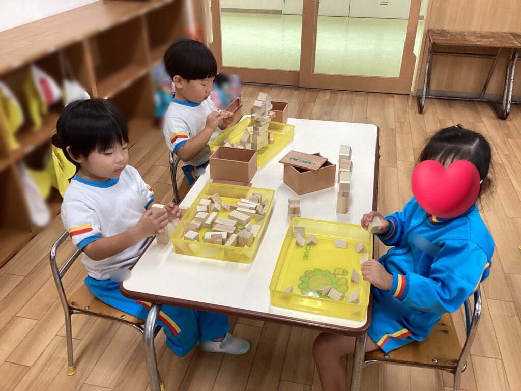 積み木遊びではお家やお城を作るお友達の他に神社を作っているお友達もいました。