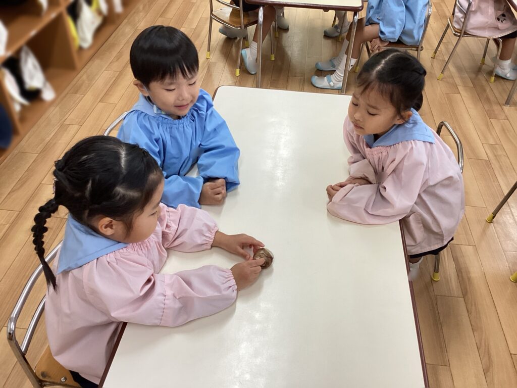 球根を各グループに配ると、「ニンニクかな?」「たまねぎじゃない?」とグループのお友達と様々な予想をしながら興味津々に観察していました。