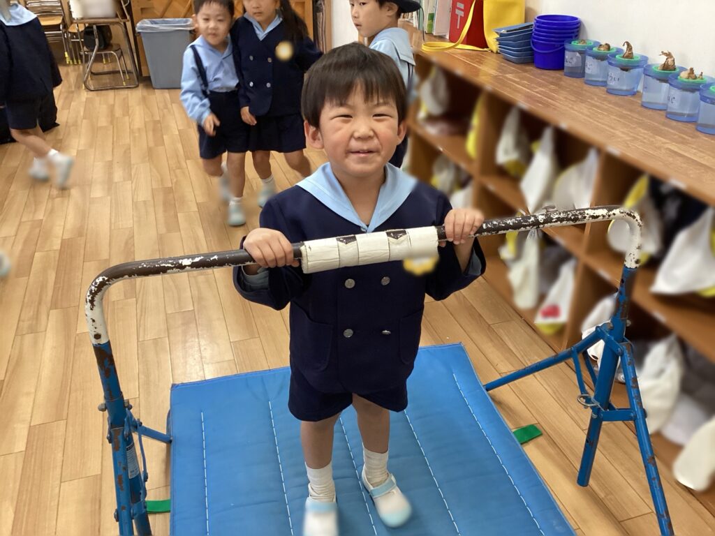 お部屋で鉄棒の練習を何度かしているのですが、それをきっかけに外遊びの時間も鉄棒に挑戦しているお友達の姿が見られるようになりました!