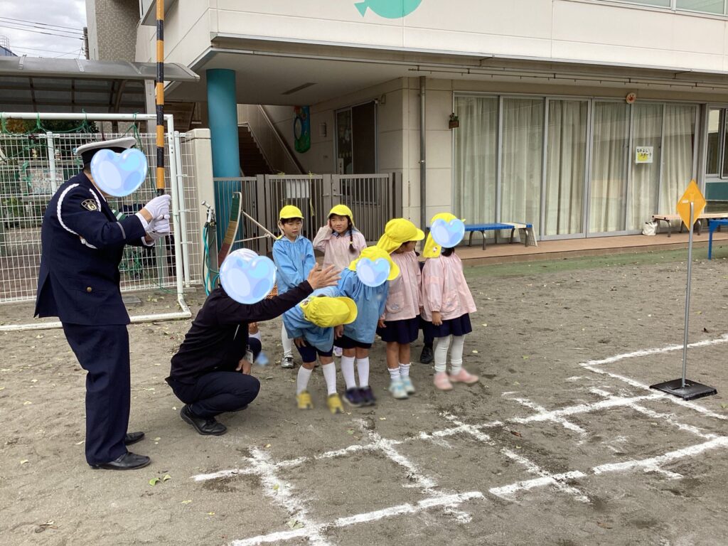 最初にお遊戯室で交通安全に関する動画を視聴し、園庭に出て実践していきました。