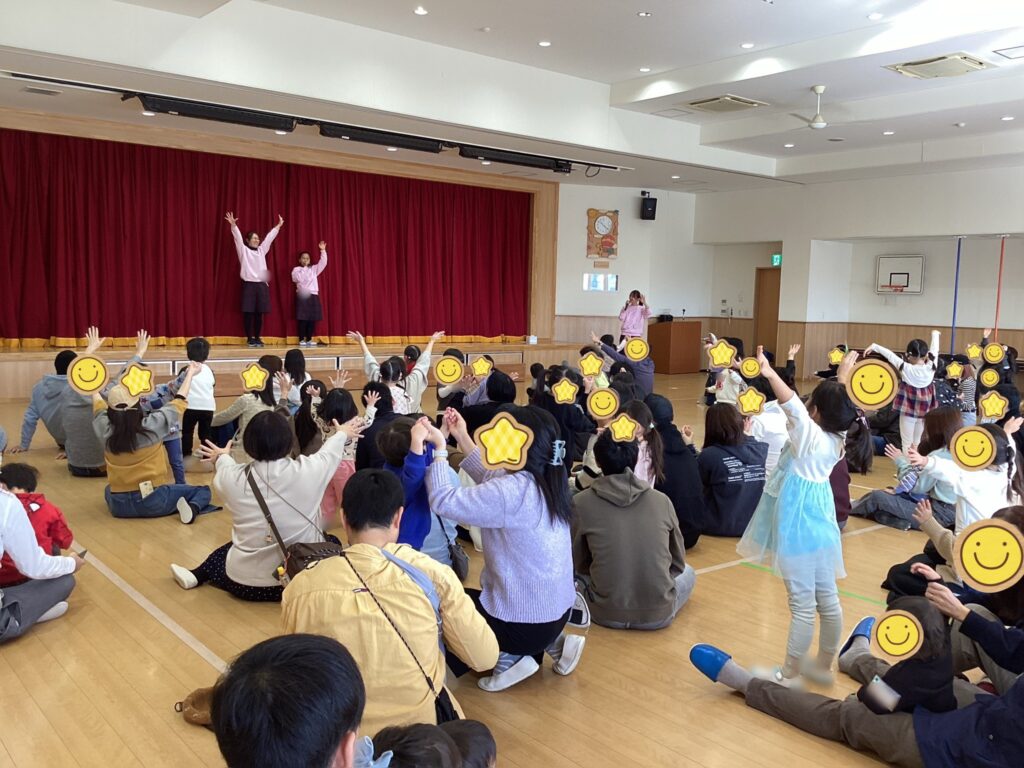 「Hokey Pokey」と言う音楽に合わせて片足を前に出したり、引っ込めたり、その場でくるりと回ってみたりして身体を楽しく動かしました。